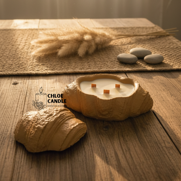 Indulge your senses with Le Croissant, a hand-poured candle sculpted into the authentic, flaky shape of a classic French croissant. Featuring three natural wooden wicks, this piece brings a touch of Parisian bakery charm and a warm, buttery glow to any space. Mais oui, it's a delightful centerpiece.